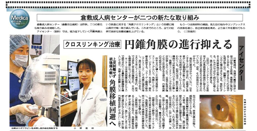 岡山県の倉敷成人病センター眼科の小野恭子先生から、角膜クロスリンキングを始めたことを山陽新聞に取り上げてもらった、とご連絡をいただきました。