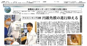 岡山県の倉敷成人病センター眼科の小野恭子先生から、角膜クロスリンキングを始めたことを山陽新聞に取り上げてもらった、とご連絡をいただきました。